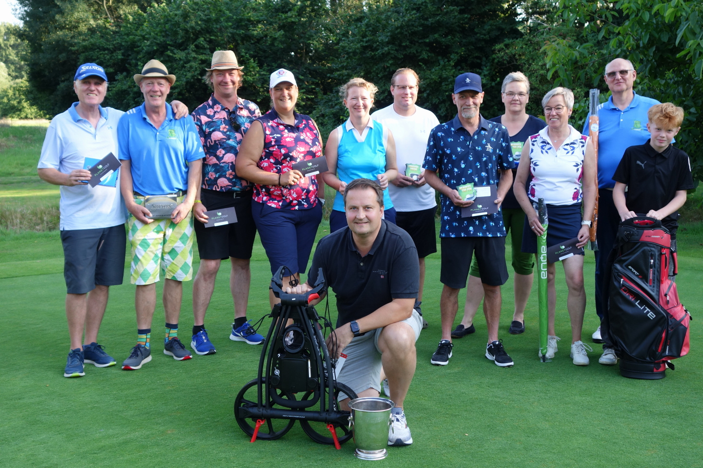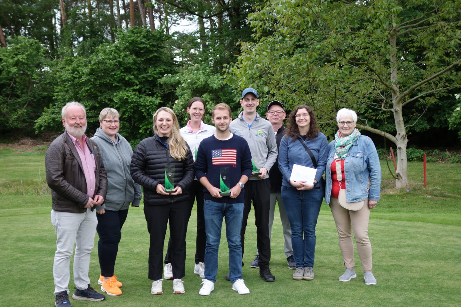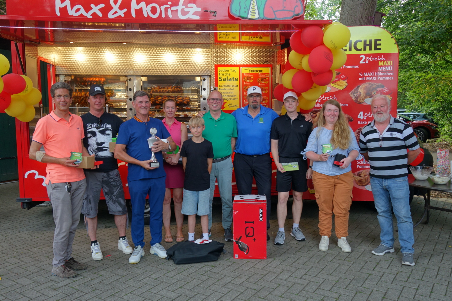 v.l. Gernot Stahlberg, Christian Robin, Hartwig Schlosser, Katja Ebbing, Henrik Buddenkuhl, Jürgen Decker (Max & Moritz), Holger Rickert, Moritz Meissner, Jana und Hartmut Grotholtmann (Präsident GC Ladbergen) -